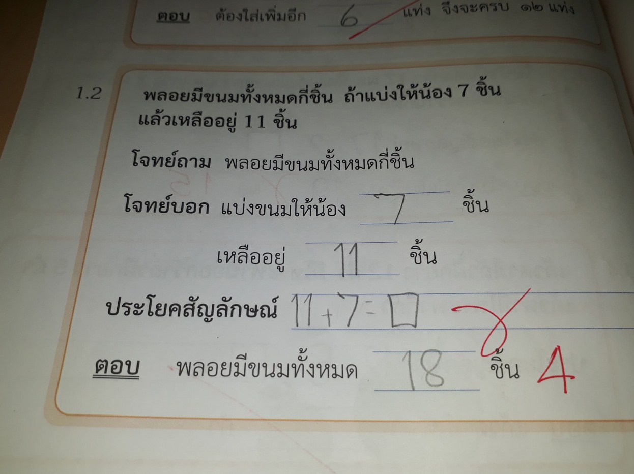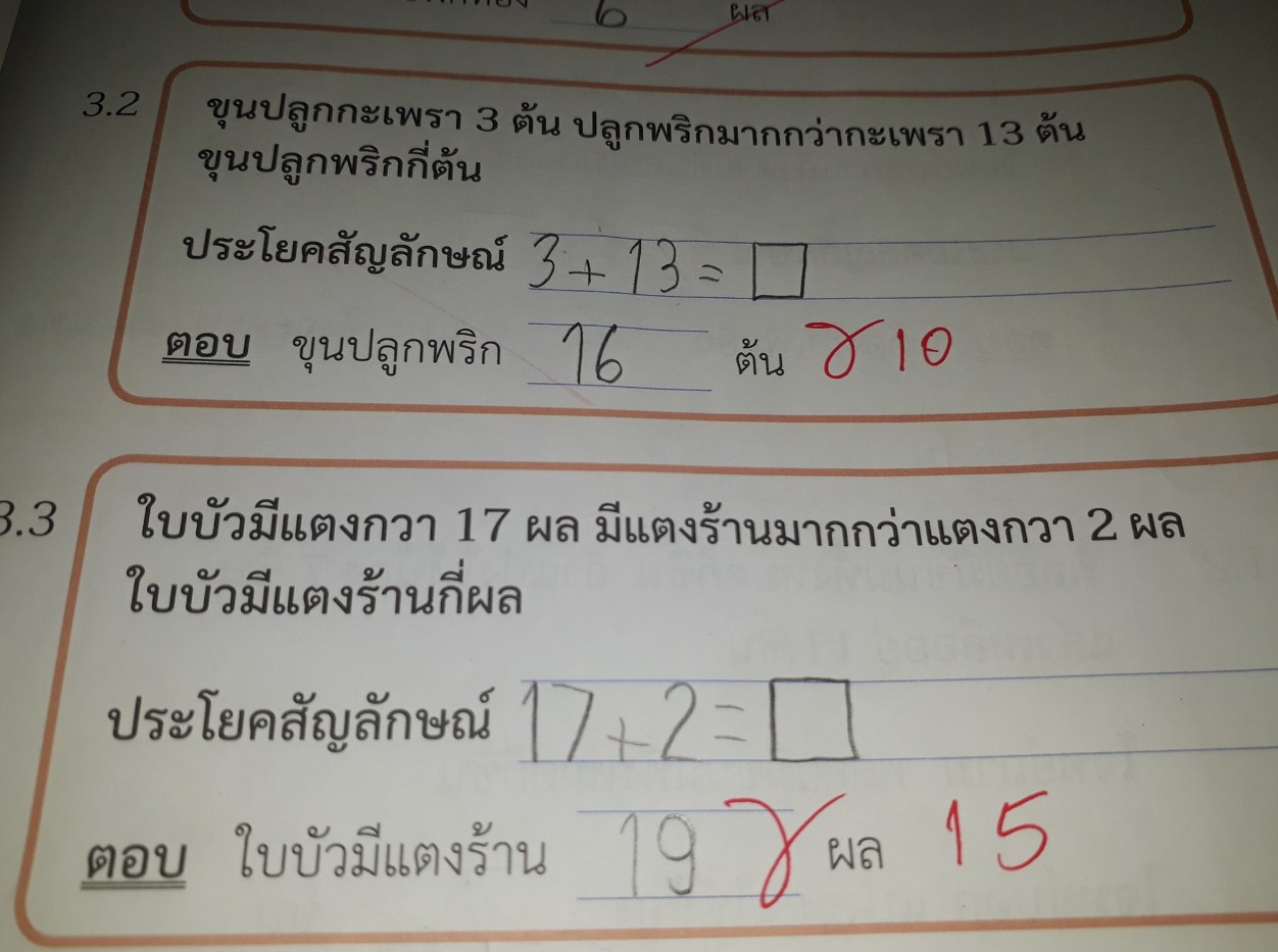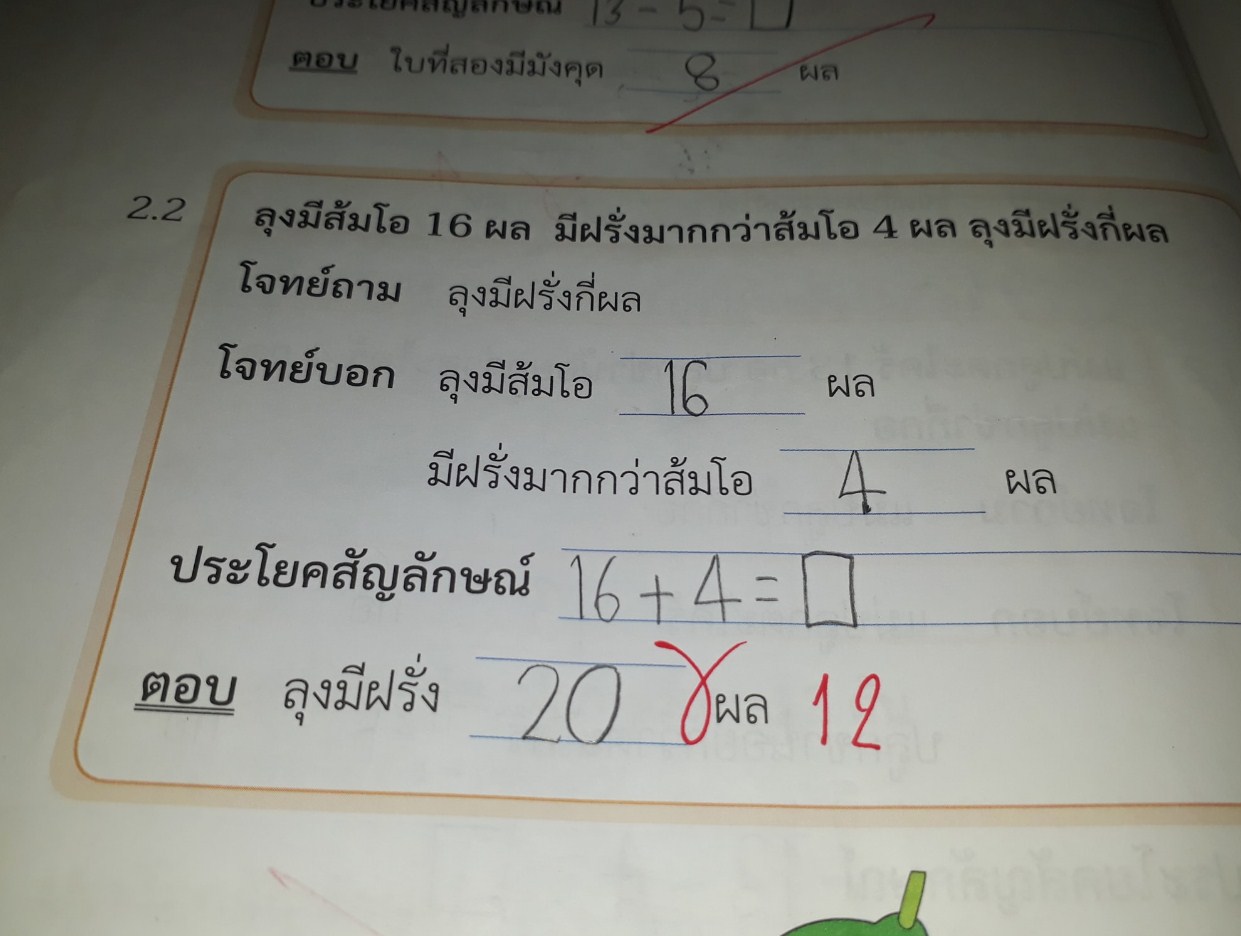 Theo đó, bài toán có ghi: “Nếu Joy có 12 quả xoài, Joy lấy thêm 8 quả xoài nữa thì Joy sẽ có tất cả bao nhiêu quả xoài?“. Cháu gái của Pennapa viết đáp án là 20. Thế nhưng, cô giáo lại đánh dấu “X” (sai) vào bài của em và ghi thêm đáp án đúng phải là 4.