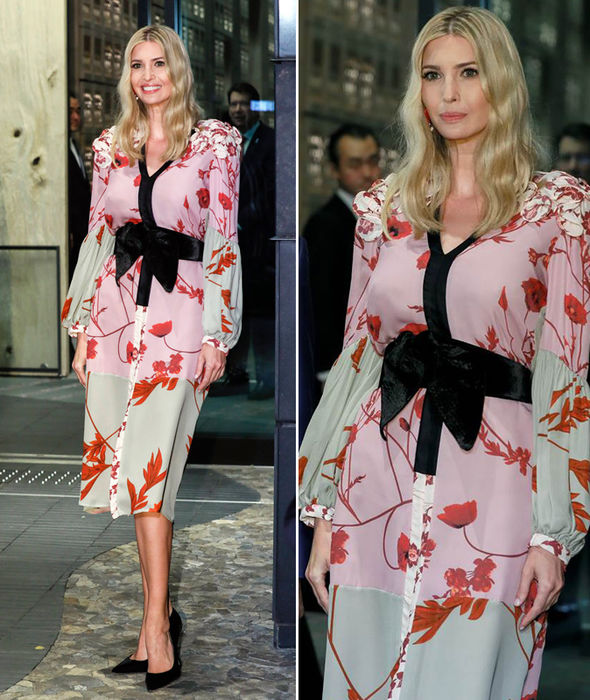 Ivanka thu hút sự chú ý của phóng viên khi xuất hiện tại bữa tiệc tối tại thủ đô Tokyo với mặc bộ váy hoa lấy cảm hứng từ kimono, trang phục truyền thống của Nhật Bản. Bộ váy của nhà thiết kế Johanna Ortiz có giá gần 2.000 USD.
