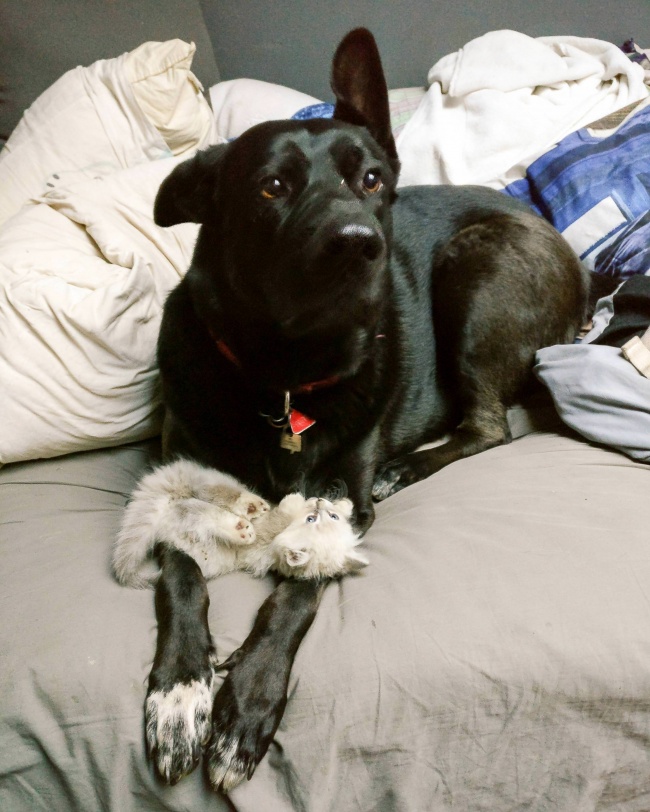 “Chú mèo con là do tôi nhặt về nuôi. Từ ngày đó, con chó của tôi chăm sóc cho mèo con vô cùng chu đáo, như con đẻ của nó vậy!”