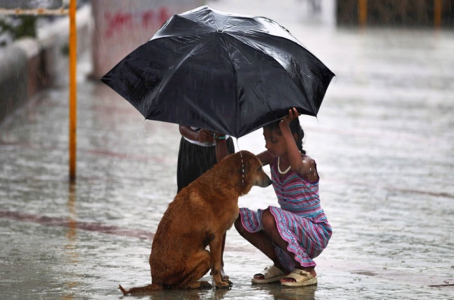 Em gái nhỏ dùng ô của mình để che mưa cho chú chó hoang.