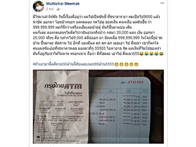 Phát hiện số tiền quá lớn trong tài khoản, Wuttichai cho là máy ATM hỏng nên liền thử sang máy khác. Nhưng khi anh sang máy ATM khác để rút, máy vẫn hiện thị số dư là 999.999.999 baht trong tài khoản.“Thấy vậy tôi thử bấm số tiền là 20.000 baht để rút thì máy thực hiện lệnh và đẩy ra đúng số tiền đã bấm”, Wuttichai viết trên tài khoản Facebook cá nhân.