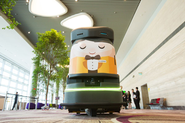 Một “nhân viên vệ sinh” robot tự động di chuyển dọc theo hành lang khu đi T4