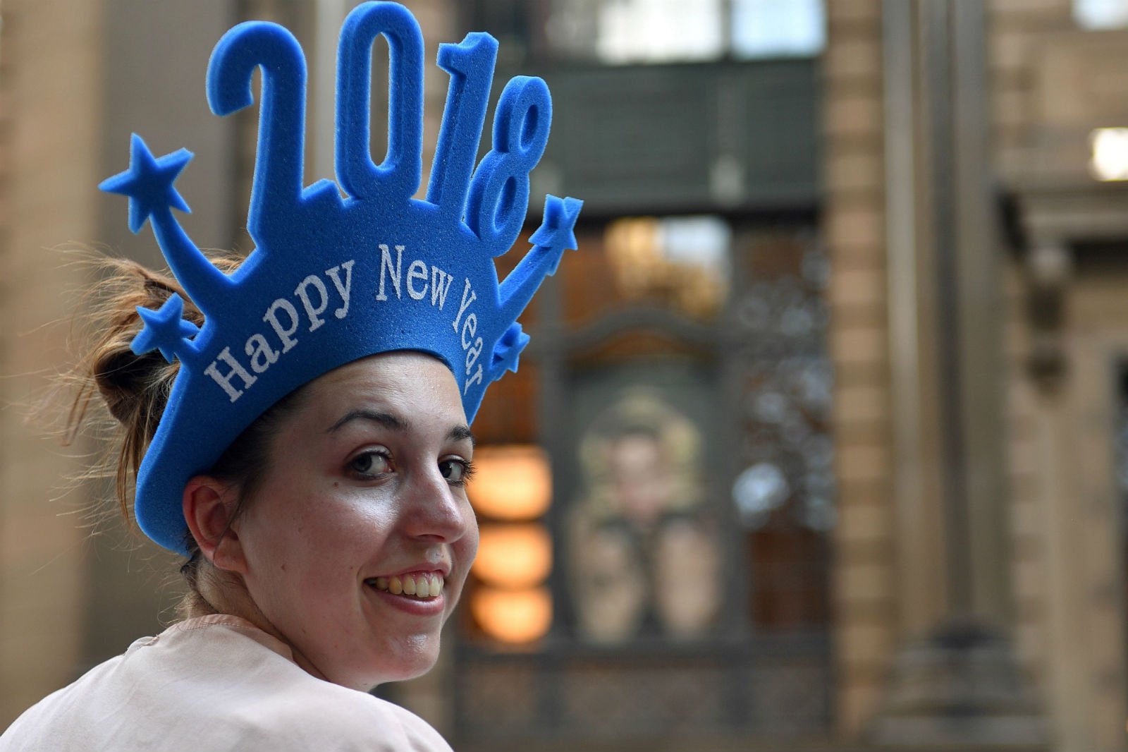 Cô gái đội mũ có dòng chữ “Chúc mừng năm mới 2018” tại thành phố Sydney, Australia.