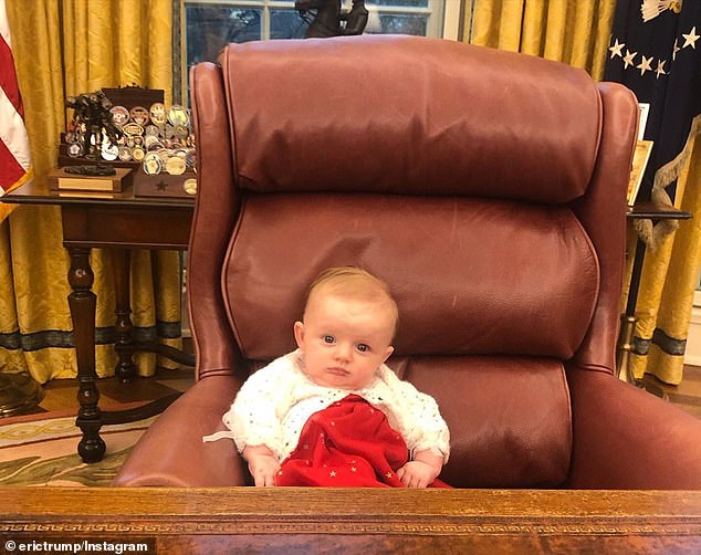 Eric Trump, 35 tuổi, hôm 16/12 chia sẻ trên Instagram bức ảnh con gái 4 tháng tuổi ngồi trên ghế làm việc của ông nội, Tổng thống Donald Trump, trong Phòng Bầu dục, theo Daily Mail.
