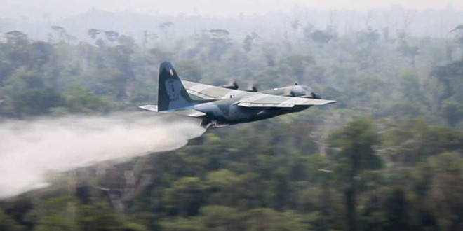 Máy bay C-130 Hercules đổ nước để dập lửa trong rừng nhiệt đới Amazon. Ảnh: AP.