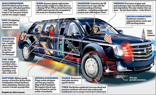 Truyền thông Mỹ cho hay Tổng thống Donald Trump hiện vẫn sử dụng mẫu limousine từng phục vụ người tiền nhiệm Barack Obama. Chiếc Cadillac One phục vụ Tổng thống Trump vẫn đang trong quá trình chạy thử. “Quái thú” của tổng thống Mỹ có lớp giáp dày khoảng 20 cm, riêng cửa kính oto dày 13 cm và được cấu thành từ 5 lớp. Trong xe trang bị điện thoại mã hóa, hệ thống video tương tác để tổng thống có thể gọi điện hay tổ chức cuộc họp ngay trong lúc di chuyển.