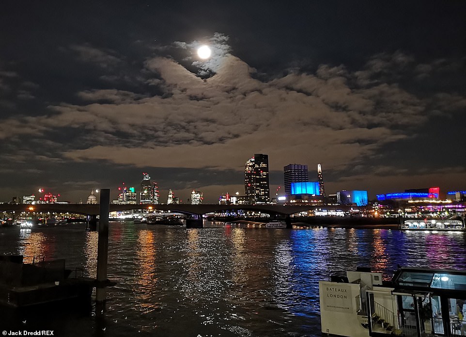 Trăng tròn đầu tiên của năm 2020 chiếu sáng rực rỡ và phản chiếu xuống dòng sông Thames, Anh.
