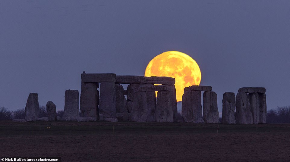 Mặt trăng mọc trên Stonehenge ở Wiltshire, với ánh sáng màu cam, trước nguyệt thực tối thứ sáu. Mỗi năm, thế giới đón từ 2 đến 5 lần nguyệt thực và khoảng 1/3 trong số đó là nhật thực hình bán nguyệt.