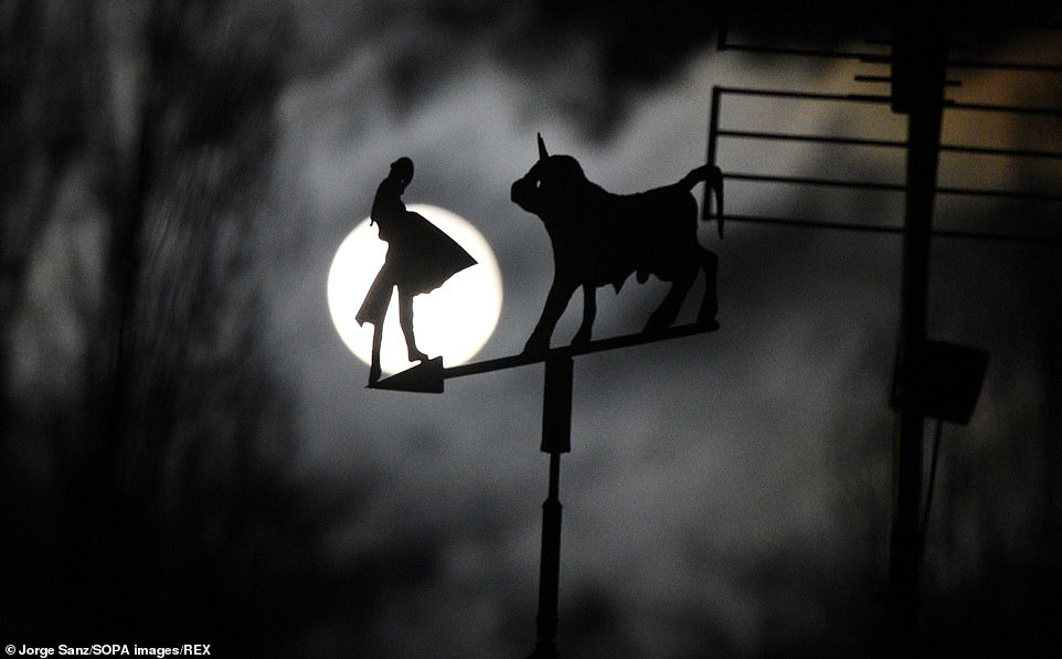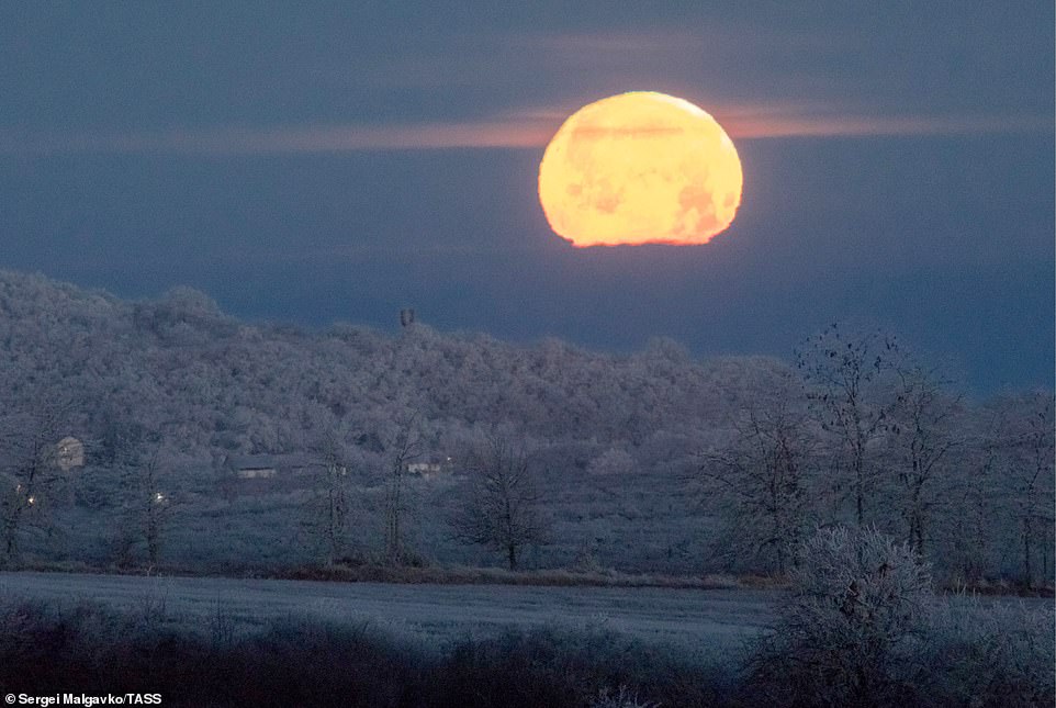 “Mặt trăng sói” mọc lên trên đồi Menwith gần Harrogate, Bắc Yorkshire, Anh tối qua. Hiện tượng nguyệt thực bắt đầu vào khoảng 5h chiều, khi trăng tròn đầu tiên của thập kỷ đi qua bóng của Trái đất.