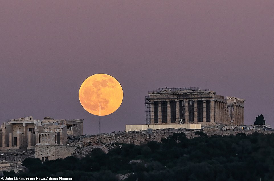 Mặt trăng trên bầu trời khu vực đền Parthenon tại Acland ở Athens, Hy Lạp.