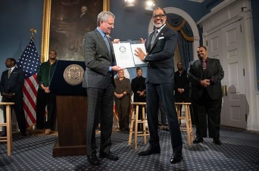 Robert Cornegy (phải) nhận chứng nhận Guinness từ Thị trưởng New York Bill de Blasio - Ảnh: Văn phòng Hội đồng thành phố New York