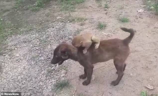 Video cho thấy khỉ con bám trên lưng chú chó khi hai con vật được phát hiện tại Sở cảnh sát Rehli ở Madhya Pradesh, Ấn Độ. Con chó vẫy đuôi trong khi con khỉ con nằm trên lưng nó. .