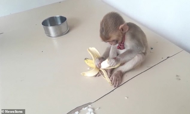 Cảnh sát sau đó cho khỉ con ăn chuối, giúp nó gọt vỏ trái cây.