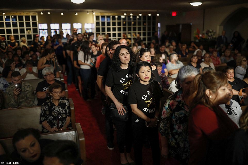Những người không thân quen đã bất chấp nắng nóng của ngày 16/8 để đứng bên ngoài Trung tâm Tín ngưỡng La Paz để dự tang lễ của bà Margie Reckard, 63 tuổi, một trong 22 nạn nhân của vụ xả súng đẫm máu ở siêu thị Walmart trong thành phố El Paso hồi đầu tháng này.