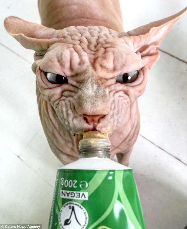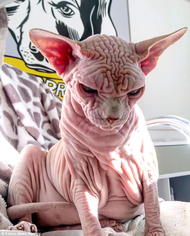 Xherdan (5 tuổi), chú mèo Sphynx (giống mèo không lông), đang sống cùng chủ Sandra Filippi (45 tuổi) ở Thụy Điển. Với ngoại hình dị thường, Xherdan hiện có gần 5.000 người theo dõi trên Instagram, nơi cô chủ Sandra thường đăng tải nhiều bức hình cho thấy Sphynx với làn da nhăn nheo và khuôn mặt gắt gỏng khiến nhiều người thích thú.