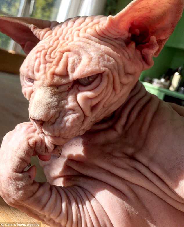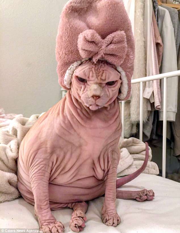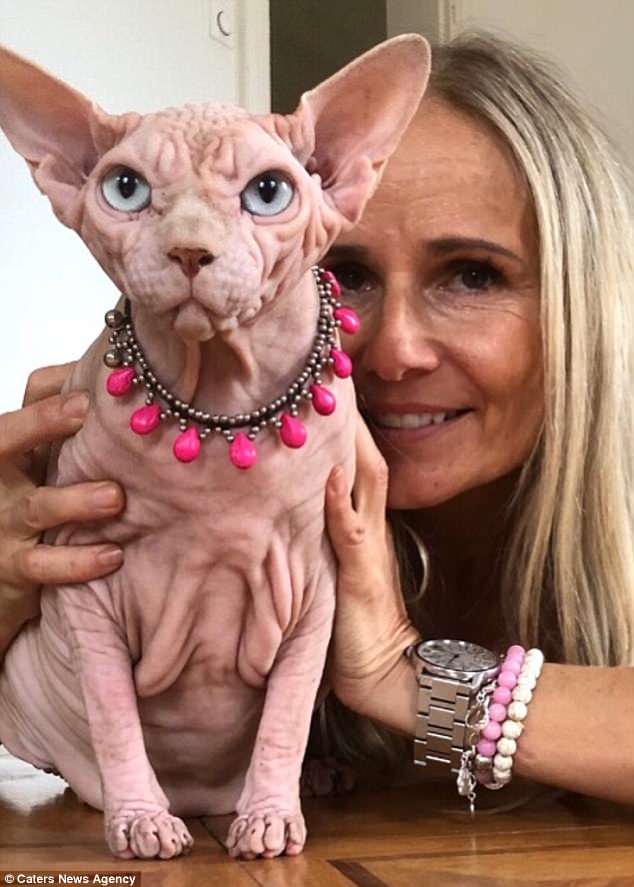 Những fan hâm mộ mèo Xherdan thích thú với làn da không một sợi lông và hồng “như một trái đào” theo lời mô tả của cô chủ Sandra.