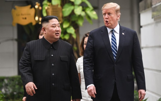 Nhà lãnh đạo Triều Tiên và Mỹ đi dạo cùng nhau trong khuôn viên khách sạn Metropole Hà Nội sáng nay. Ảnh: AFP