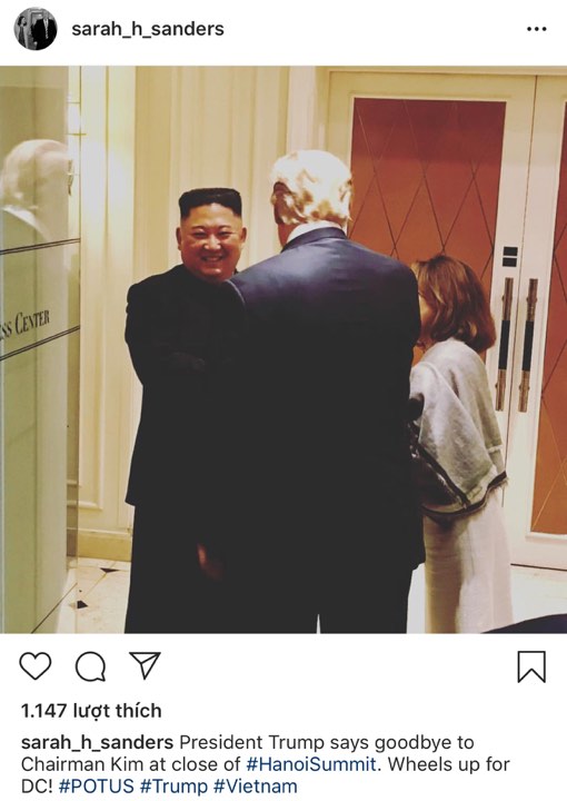 Tinh thần thân thiện giữa ông Kim và ông Trump nhanh chóng được Thư ký Báo chí Nhà Trắng Sarah Sanders ghi lại và đăng tải trên Instagram. Bà Sarah viết: “Tổng thống Trump chào tạm biệt Chủ tịch Kim khi hội nghị tại Hà Nội khép lại“.