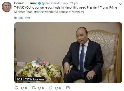 Trong khi đó, sau khi lên lên máy bay để về nước, Tổng thống Trump có đăng lên Twitter cá nhân một đoạn video ghi lại hình ảnh lúc ông ở Việt Nam trong những ngày diễn ra hội nghị thượng đỉnh vừa qua cùng lời cảm ơn tới Việt Nam.