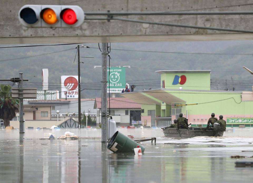 Lực lượng phòng vệ Nhật dùng xuồng nhỏ di tản người dân bị ảnh hưởng vì mưa lũ ở TP Kurashiki, phía nam Nhật Bản. Lượng nước dâng lên cao khiến khu vực này biến thành một cái hồ lớn.