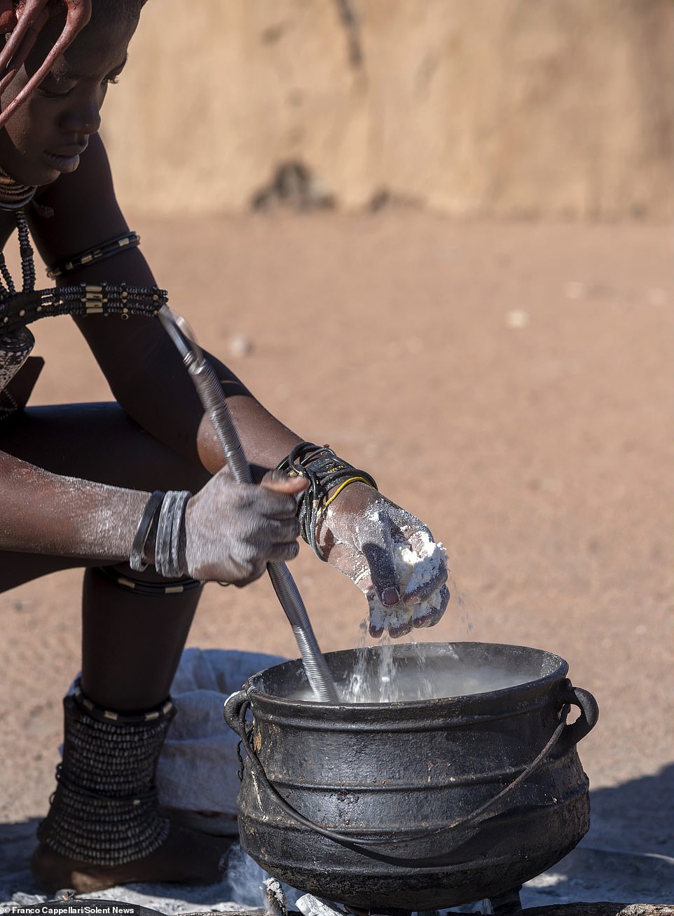 Nhiếp ảnh gia Franco Cappellari đã chụp những bức ảnh tuyệt đẹp của bộ lạc khi đến thăm đất nước châu Phi. Người đàn ông 61 tuổi, đến từ Venafro, gần Naples, nước Ý này nói rằng: “Người Himba là những người rất thân thiện và tốt bụng. Tôi đã dành trọn một ngày để thăm thú ngôi làng của họ cùng với một hướng dẫn viên địa phương. Những người phụ nữ ở đây cực kỳ có ý thức làm đẹp và dành nhiều thời gian chăm chút cho ngoại hình của họ. Họ tạo ra hỗn hợp Otjize từ chất béo và bơ màu nâu đỏ, thảo mộc và sau đó bôi lên cơ thể mình”