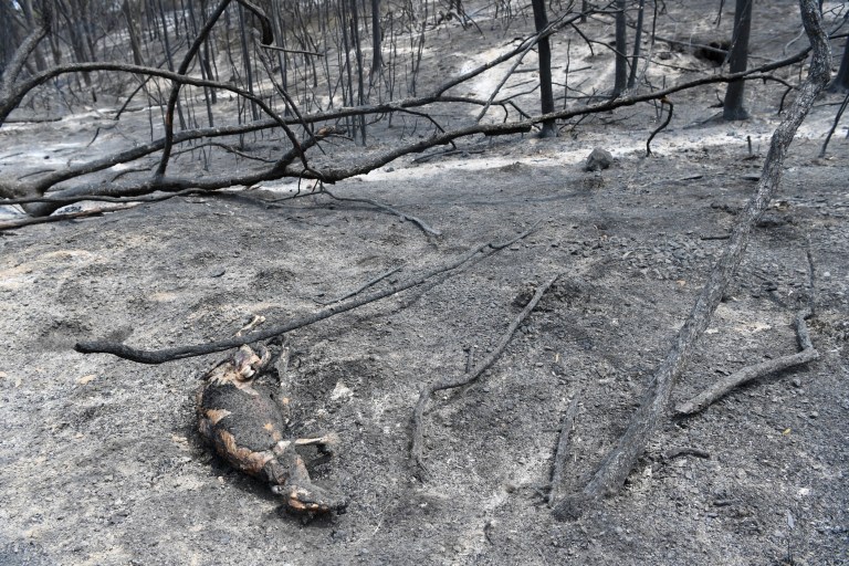 Xác chết cháy đen của một con kangaroo ở Sarsfield, Đông Gippsland, Victoria.