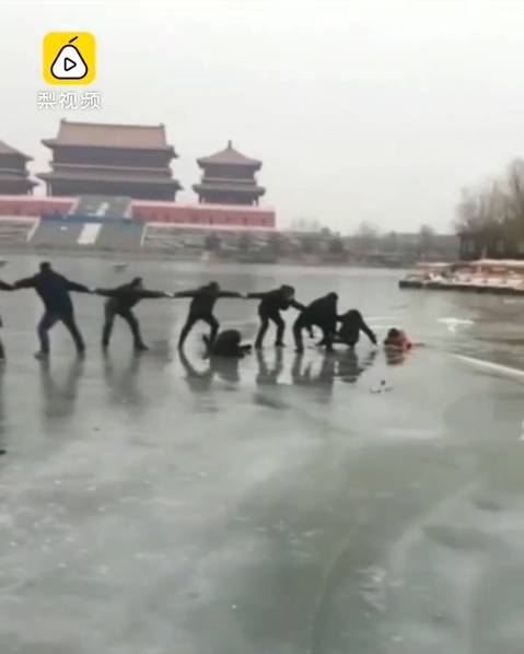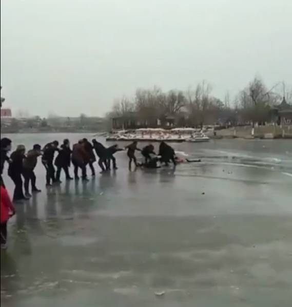 Khi sự việc xảy ra, hai mẹ con nhanh chóng được mọi người phát hiện. Tuy nhiên, tại nơi họ rơi xuống nước chưa đóng băng hết và rất trơn nên rất khó giải cứu. Khoảng 20 người bao gồm cả nam nữ, già trẻ đang chơi gần đó đã đồng lòng nắm tay nhau tạo thành một “sợi dây sống” kéo người gặp nạn lên từ hồ nước đóng băng.