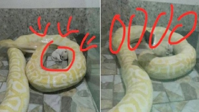Chú chó nhỏ nằm gọn trong lòng con trăn khổng lồ. Có thể nó đang ngủ hoặc bị siết chết.