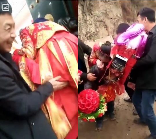 Theo đó, trong một đám cưới diễn ra tại tỉnh Cam Túc vào ngày 18/3 vừa qua, bố chồng buộc phải mặc một bộ trang phục kỳ lạ để cõng con dâu trong trang phục truyền thống vào nhà. Tuy nhiên, trong quá trình này, một đám khách nam đi phía sau lại nhân cơ hội chạm, vỗ vào mông và phần thân dưới của cô dâu khiến cô vô cùng bối rối. Không một chút ngượng ngùng hay xấu hổ, những người đàn ông lại cười khoái chí trước hành động thô lỗ này.