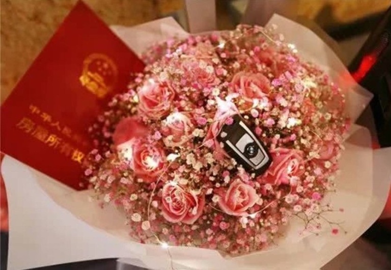 Quà cầu hôn gồm một bó hoa, một sổ đỏ căn nhà và một chiếc BMW.