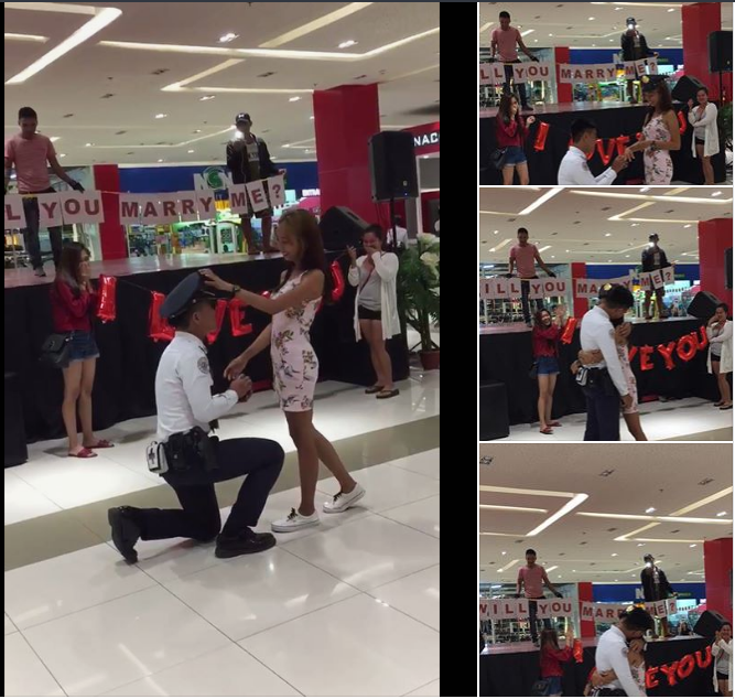 Anh chàng tình cờ bắt gặp cảnh tượng cô gái có tên là Wyndell Ybañez Aguilar đang quỳ gối cầu hôn bạn trai Rengie Montes Matalang. Cả hai đều là bảo vệ của trung tâm thương mại CityMall.