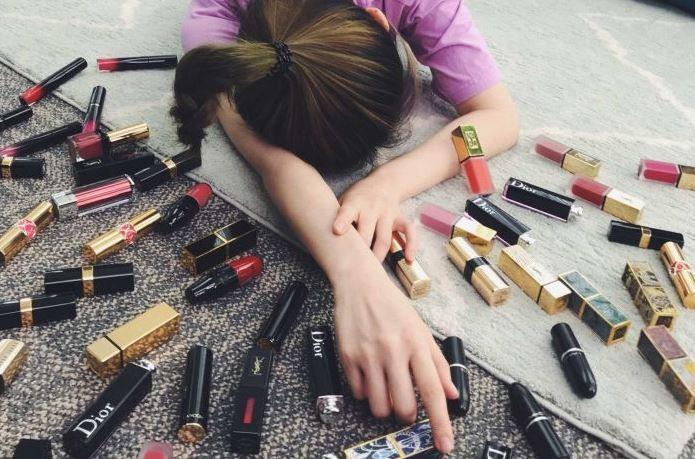 Theo trào lưu, một người phụ nữ xuất hiện với tư thế úp mặt và bao quanh là những thỏi son môi hàng hiệu. Ảnh: The Sun