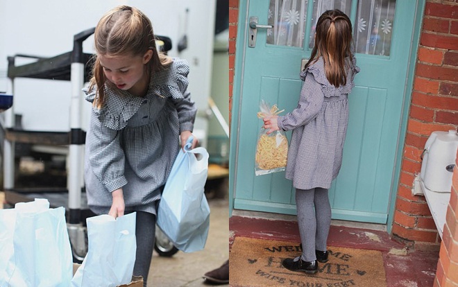 Công chủa Charlotte giúp đem những túi thức ăn tới những người già bị ảnh hưởng bởi dịch COVID-19.