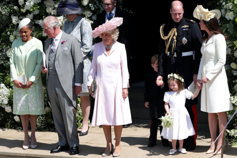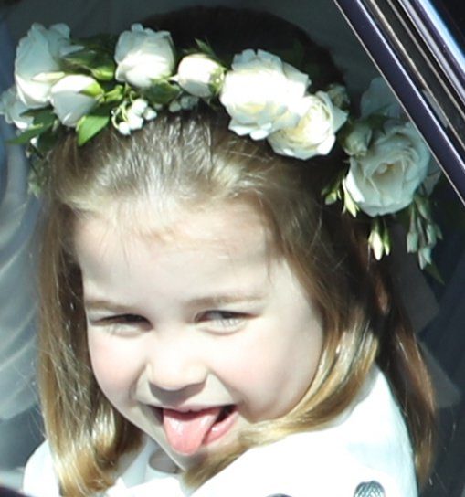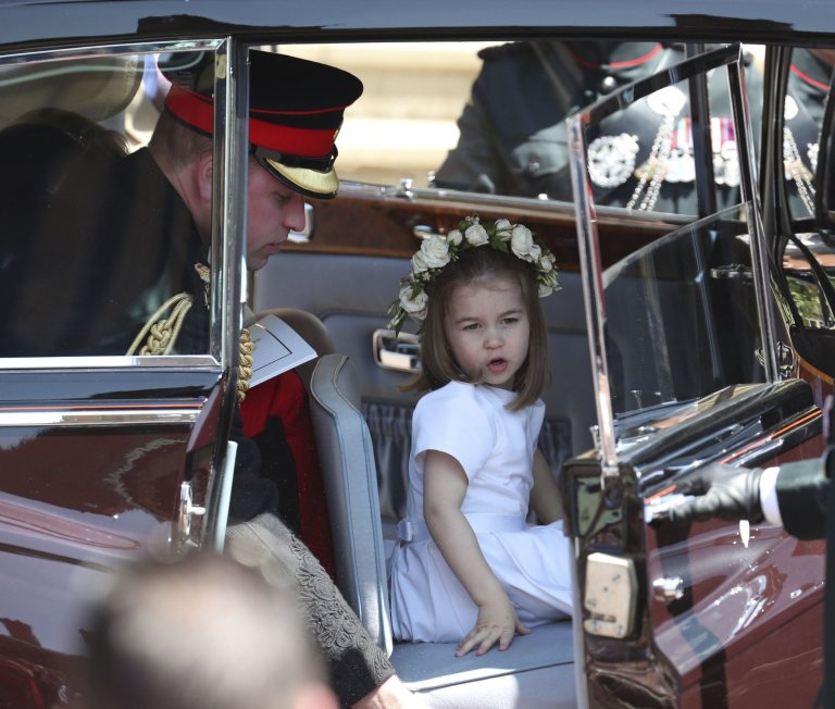 Biểu cảm đáng yêu của Công chúa Charlotte, 3 tuổi, khi ngồi trong xe hơi tới lâu đài Windsor để dự đám cưới Hoàng tử Harry. Cô bé là một trong 5 phù dâu nhí của cựu diễn viên người Mỹ Meghan Markle tại đám cưới. Ảnh: PA