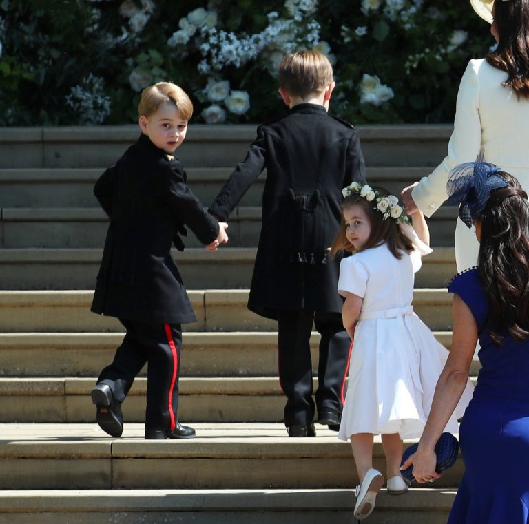Cô bé diện váy trắng, đội vòng hoa đang vẫy tay chào người dân và báo giới khi đứng trên bậc thang nhà nguyện George.
