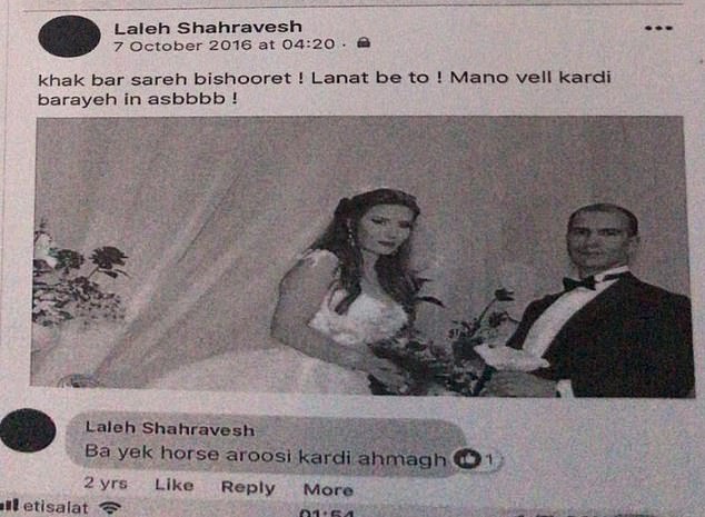 Theo đó, vào năm 2016, ông Pedro một mực đòi ly hôn với cô Laleh để kết hôn với một người phụ nữ trẻ hơn và cùng người này tới Dubai sinh sống. Tức giận vì bị người chồng 18 năm chung chăn chung gối phụ bạc nên khi nhìn thấy tấm ảnh cưới của ông Pedro và người vợ mới là Samah al Hammadi (42 tuổi, người Tunisia) trên Facebook, cô Laleh đã không ngần ngại buông lời thoái mạ cặp đôi này.