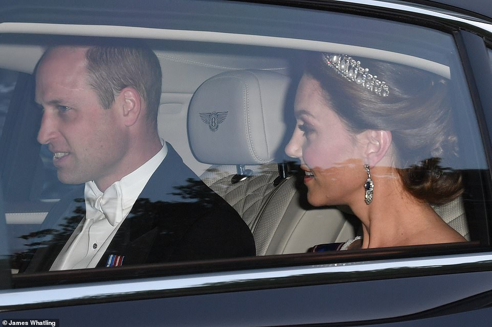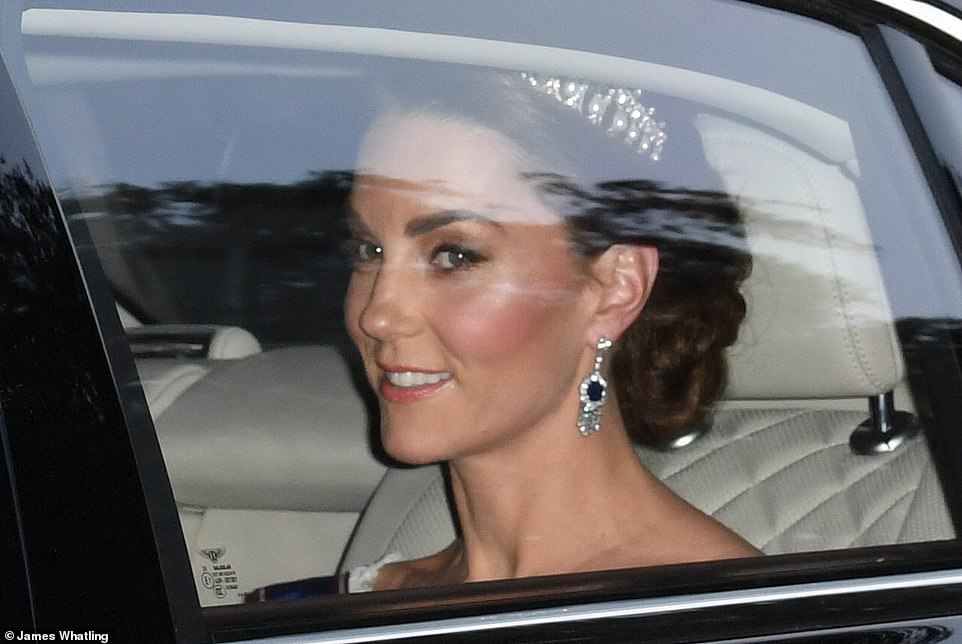 Nữ công tước xứ Cambridge Kate Middleton trông thật quyến rũ khi khoác lên mình chiếc đầm ren trắng đến từ thương hiệu yêu thích Alexandra McQueen. Trên đầu là chiếc vương miện huyền thoại Cambridge Lover's Knot phối hợp rất ăn ý cùng đôi tai bằng sapphire và kim cương The Queen Mother khi cô cùng chồng là Hoàng tử William trên đường đến bữa tiệc.