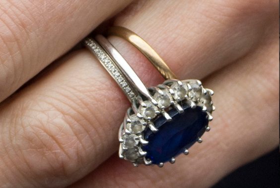 Cùng với nhẫn cưới, chiếc nhẫn kim cương 0,23 carat này khéo léo ẩn mình sau viên sapphire hoành tráng đính trên chiếc nhẫn mà William dùng để cầu hôn cô. Được biết, món trang sức đính sapphire quý giá này đã gắn bó cùng gia đình hoàng gia suốt 37 năm, là chiếc nhẫn Công nương Diana hết sức yêu thích lúc còn tại thế.