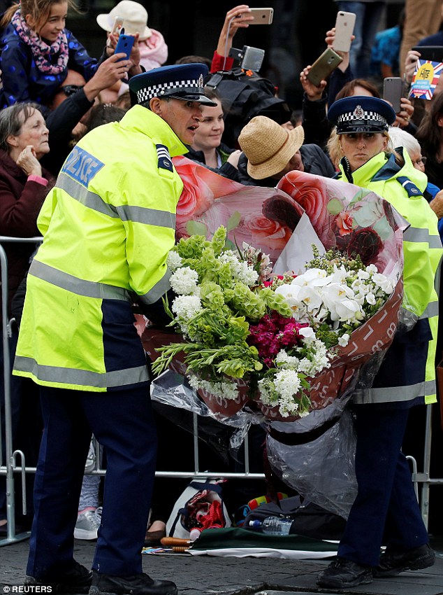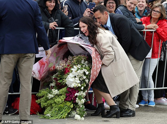 Có vẻ như fan hâm mộ này đã hái hết số hoa trong vườn nhà để tặng cho nữ công tước xinh đẹp Meghan Markle một bó hoa khổng lồ. Thủ tướng New Zealand Jacinda Ardern, cười tươi nhưng thực ra bà đang rất cố vật lộn để xử lý bó hoa khổng lồ giúp Công nương Meghan. Ảnh: Daily Mail