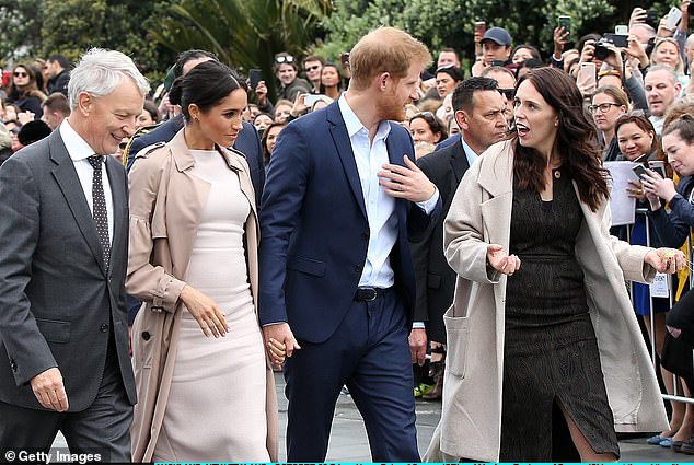 Vợ chồng Hoàng tử Harry trò chuyện cùng Thủ tướng New Zealand Jacinda Ardern trong sự vây quanh của hàng nghìn người hâm mộ. Ảnh: Daily Mail