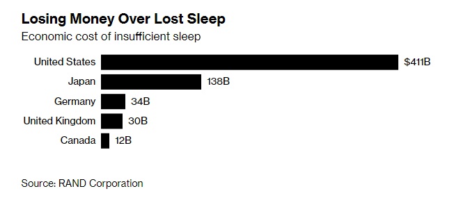 Thiệt hại về kinh tế do giấc ngủ của nhân viên không đảm bảo ở các nước Mỹ, Nhật, Đức, Anh và Canada lần lượt là 411 tỷ USD, 128 tỷ USD, 34 tỷ USD, 30 tỷ USD và 12 tỷ USD theo nghiên cứu vào năm 2009. Nguồn: Tập đoàn RAND