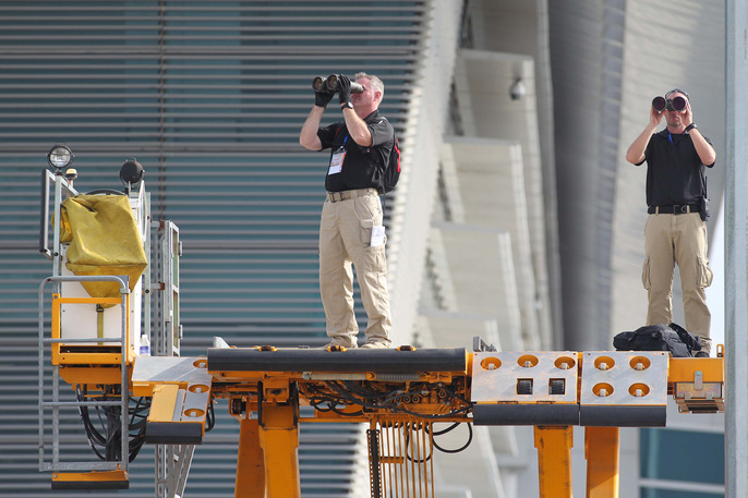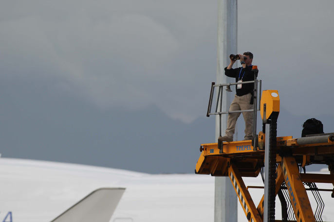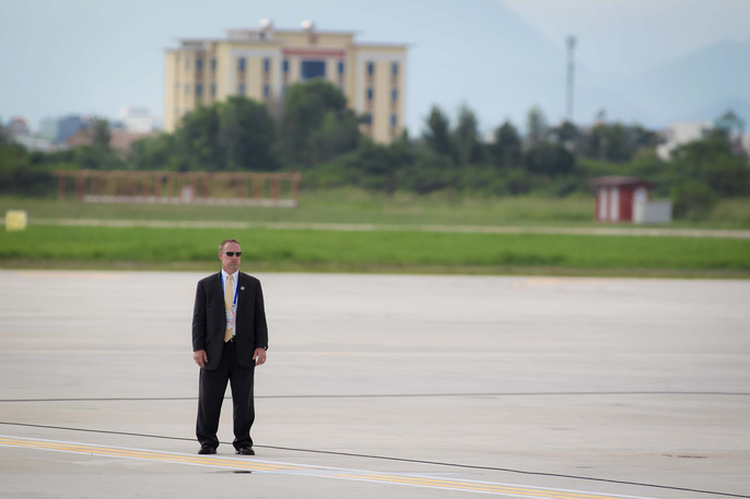 Ống nhòm chuyên dụng có tầm nhìn xa từ 2-5km, rất thuận tiện cho việc quan sát các dấu hiệu khả nghi. Mật vụ quan sát cẩn thận bằng ống nhòm ở sân bay Đà Nẵng, nơi chiếc chuyên cơ Air Force One chuẩn bị cất cánh.