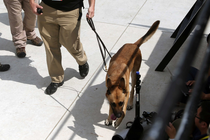 Nhân viên mật vụ mang theo chó tuần tra. Chó nghiệp vụ Mỹ chủ yếu là giống bec-giê Đức và Bỉ, thuộc Đơn vị K9 của Mật vụ Mỹ.