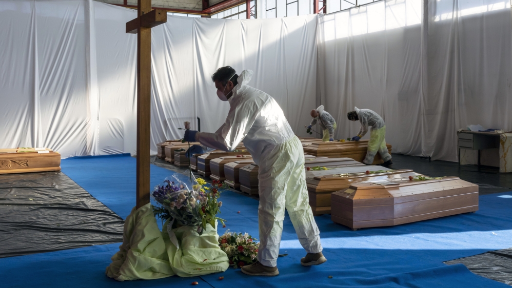 Một thành viên của Dịch vụ Bảo vệ Dân Italy dọn dẹp xung quanh khu vực đặt 18 quan tài của người chết vì COVID-19 đang chờ máy bay của quân đội vận chuyển đi hỏa táng tại Florence. Ảnh: Reuters