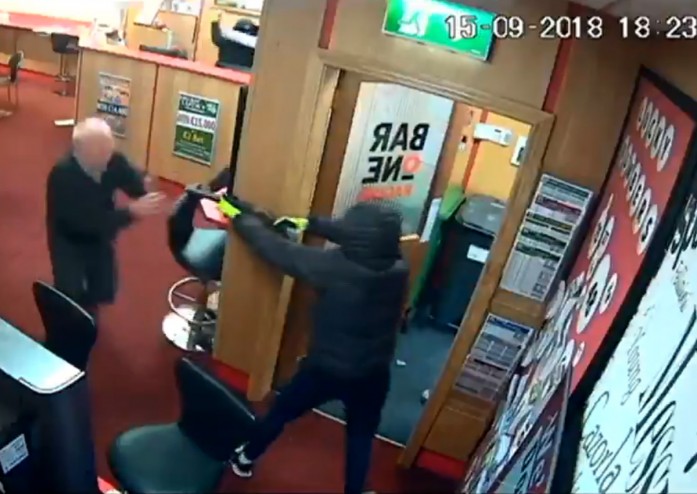 Một trong 3 tên côn đồ đe dọa anh Tim Murphy, yêu cầu quản lý cửa hàng đưa tiền mặt trong két cho chúng. Nhưng có vẻ như Murphy không chấp thuận. Tên cướp trèo qua quầy dịch vụ và định tấn công người quản lý bằng chiếc búa đang cầm trên tay.