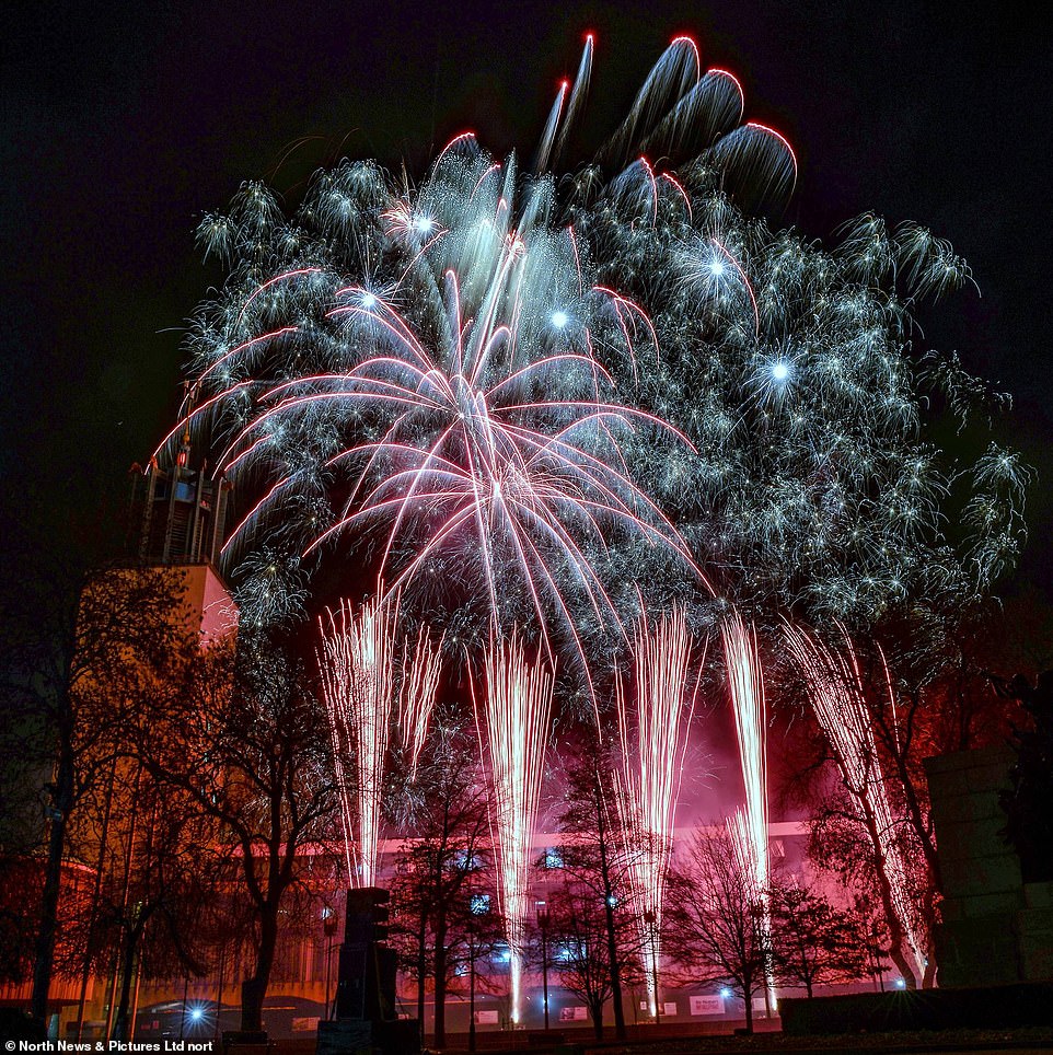 Pháo hoa thắp sáng bầu trời đêm phía trên Trung tâm hành chính ở Newcastle.