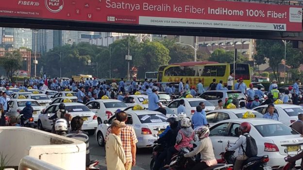 Ngày 22/3/2016, hàng nghìn lái xe taxi đã đình công và phong tỏa các con đường bên ngoài Quốc hội Indonesia, các văn phòng chính quyền thành phố và Bộ Thông tin, khiến nhiều khu vực ở thủ đô Jakarta, Indonesia bị tê liệt, đến mức muốn bắt một chiếc taxi vào trung tâm thành phố là điều không thể. Không chỉ vậy, một số người còn đập phá xe cộ và hăm dọa những ai không tham gia đình công.