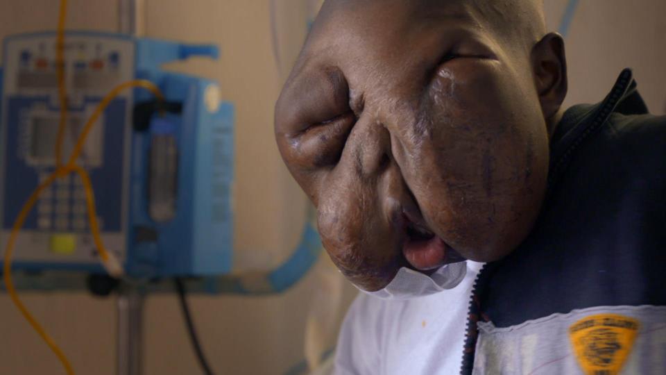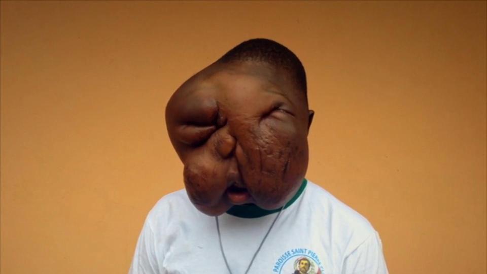 Khuôn mặt cậu bé biến dạng vì khối u. Ảnh: BARCROFT PRODUCTIONS
