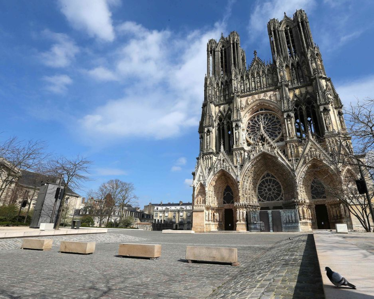 Quảng trường trước Nhà thờ chính tòa Đức Bà Reims (Pháp) không một bóng người từ khi áp dụng lệnh cấm.
