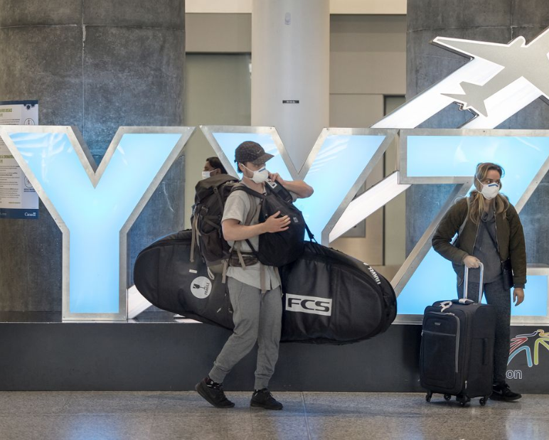 Một cặp đôi đeo khẩu trang tại Nhà ga số 1 của Sân bay Toronto Pearson, Canada.
